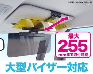 | This polarized anti-glare sun visor features two screens for daytime and nighttime driving. Easily attached, even in vehicles that come factory-equipped with oversized sun visors. (Supports sun visors measuring between 140 and 255mm (5.51 and 10.04 in) from front to back.) The polarized visor slides up to 60mm (2.36 in) forward and back and up to 90mm (3.54 in) left and right for ideal positioning. (Allows continued access to the visor mirror on standard mirror-equipped sun visors.) |