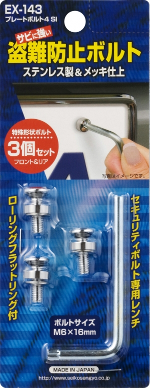 | This countersunk security screw set was awarded 4th place in the nuts and bolts division of Minkara’s 2016 Parts of the Year Competition. (Minkara is one of Japan’s major car and car accessory review sites.) This security screw set provides effective protection against tampering and theft through the use of uniquely-designed star sockets and a corresponding key wrench. Uses countersunk screws and washers for a flush appearance. (Includes 3 each screws and washers per set.) |