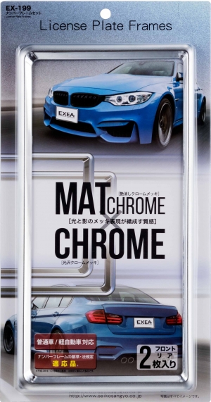 | Their design incorporates both matte and lustrous metal plated elements for a stylish appearance. Composed of molded resin with an attractive chrome-plated finish. The set fits Japan’s standard and kei-size license plates. (Includes 2 frames per set, 1 each for a front and rear plate.) |