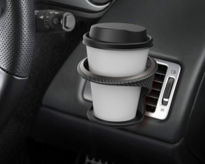 | ● Simple, stylish drink holder that mounts to the air vent. ● Sporty carbon‑look finish adds an upscale touch to the interior. ● Three soft rubber supports provide stable holding and help reduce rattling noise. ● Holds convenience‑store coffee cups, wide and slim cans, and 600 mL PET bottles (Ø53–73 mm / 2.09–2.87 in). |
