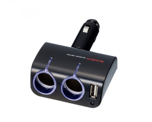 | This vehicle charging adapter provides one 5V / 1.2A USB port as well as an independently housed set of two 12V power sockets. Supplies power and charging over USB for iPods, smartphones, etc. It can be freely rotated to a desired orientation. |