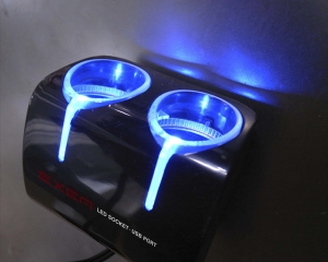 | This vehicle charging adapter provides one 5V / 1.2A USB port as well as an independently housed set of two 12V power sockets. Supplies power and charging over USB for iPods, smartphones, etc. The separate housing includes a stand, allowing for free 360-degree rotation after mounting. |