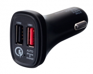 | This vehicle charging adapter is Qualcomm® Quick Charge™ 2.0 certified. It features one USB port for rapid charging of Qualcomm® Quick Charge™ 2.0 compatible smartphones and tablets, as well as one auto-detecting USB port able to provide optimal charging conditions to iPhone and Android devices. * Compatible Models for Quick Charge™ Port: docomo models featuring support for “Quick Charge™ 2”; au and SoftBank models featuring support for “Quick Charge™ 2.0” * USB Power Output to Compatible Models on Quick Charge™ Port: automatic selection of 5V / 2.4A, 9V / 2A or 12V / 1.5A based on device * USB Power Output on Auto-Detecting Port: 5V / 2.4A For use in vehicles with 12V DC. (Caution: for use in vehicles with negatively grounded electrical systems only) |