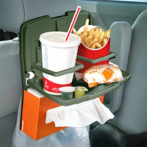 | * This compact seat-back tray table fits neatly on the headrest portion of the seat. * Can hold 500 ml drink cartons, cans both wide and narrow, and 500 ml plastic bottles. * A box of tissues can be easily attached using the specially designed tissue-box hook. * Can hold a box of tissues and can hang a plastic plastic bag for holding trash. |