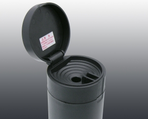 | This ashtray features a sloped mouth with a center hole to catch ash and butts and let them extinguish themselves naturally inside. Its tall, high-volume design allows for extended use between cleanings. |