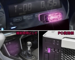 | This illuminating USB port cover protects ports from dust and other foreign objects. Its pink light is perfect for adding a stylish highlight to your surroundings. (Includes 2 per set.) Can be installed as an auxiliary light on your vehicle’s console or on a PC, etc. |