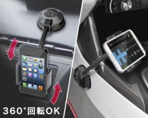 | This vehicle smartphone mount uses a flexible gooseneck arm to provide a wide range of motion. Uses sliding arms that do not obstruct the device’s display. Features a 360-degree rotating joint. Freely attaches to a desired location on the dash via suction cup. (Includes gel and sticker disc for use on uneven surfaces.) |