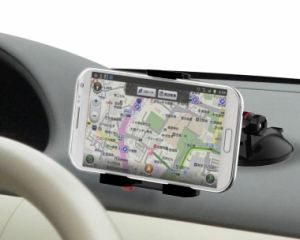 | This vehicle smartphone mount holds your device in place using a simple push grip and release button system. Freely attaches to a desired location on the dash via gel-lined suction cup. (Includes a sticker disc for use on uneven surfaces.) Holds devices securely in place with three points of contact. Accommodates devices measuring 58 - 90mm ( 2.28 to 3.54 in ) wide and up to 12mm ( 0.47 in ) thick. |