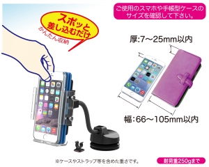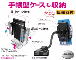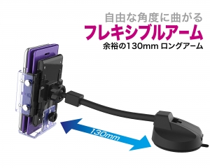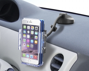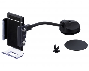 | This vehicle smartphone mount uses a flexible gooseneck arm to provide a wide range of motion. It is designed to accommodate phones in cases of all sizes from slimline cases to large wallet cases. Freely attaches to a desired location on the dash via suction cup. (Includes gel and sticker disc for use on uneven surfaces.) |