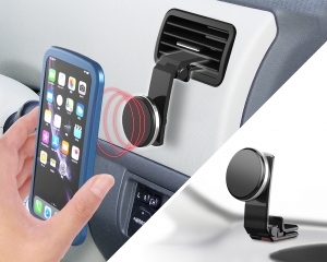 | *A magnetic smartphone holder that also easily fits notebook-type and other large-sized smartphones. *Seven powerful neodymium magnets are fixed to the holder to minimize slipping caused by car bumps. *Can be installed in two different ways, either by using the double-sided tape on the dashboard, or by mounting the clip on the air conditioning louvers. *The smartphone sits in a low-hanging position so as to not block off the flow of air from the air conditioner. This allows for the flow of cool air in summer, while giving extra peace of mind while driving in winter by ensuring that the smartphone itself does not heat up by avoiding the hot air of the heater. *The free-stop hinge mechanism allows you to stop the holder in place at whatever angle you prefer. *The half ball mechanism makes it possible to make fine adjustments to the sitting angle on the magnet surface. *Comes with a dedicated metal plate and scratch-resistant film, and a double-sided tape. |