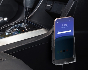 | A storage pocket that connects to your console wall with wireless charging capabilities With its smoke-colored front panel, checking your smartphone screen is a breeze Equipped with a soft base that allows for secure attachment even on curved surfaces |