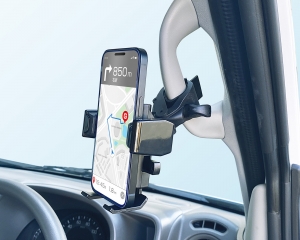 | ● Mounts to the assist grip (grab handle) so it won’t block forward visibility. ● Screw‑type clamp secures firmly to the assist grip. ● Eye‑level placement reduces eye movement—great for navigation. ● No articulated arm structure, making it resistant to vibration for steadier viewing and easier operation. ● Ideal for commercial vehicles with assist grips, such as kei vans, wagons, and trucks. ● One‑touch hold: press the phone into the holder to clamp. ● Rear ball joint lets you adjust the holder’s orientation. |