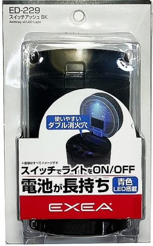 | This ashtray features a battery-powered blue LED that activates for easy nighttime use. The LED turns on and off via a switch located on the lid. Includes two round holes as well as a vertical slits for maximum convenience when putting out cigarettes. |