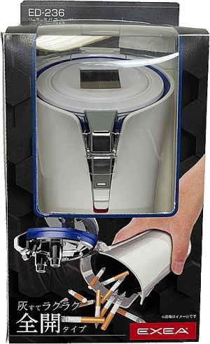 | This ashtray features a solar-powered LED for nighttime use. The lid opens at a 90-degree angle for normal use, and the lid and extinguisher portions can be opened together to a full 180 degrees. The 180-degree, fully-open position allows for ash and butts to be disposed of easily, cleanly and completely. Includes two extinguisher slots and stands for lit cigarettes, able to accommodate diameters all the way down to super slim (5–8 mm, 0.2–0.3 in). |