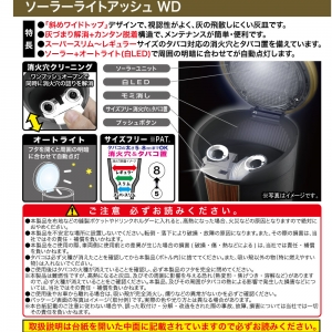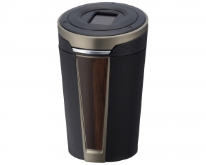 | This ashtray features a solar-powered LED for nighttime use and an elegant wood-style design, with a wide, angled mouth for ease of use. The lid swings open at the press of a button. The same button eliminates ash buildup in the extinguisher slots. |