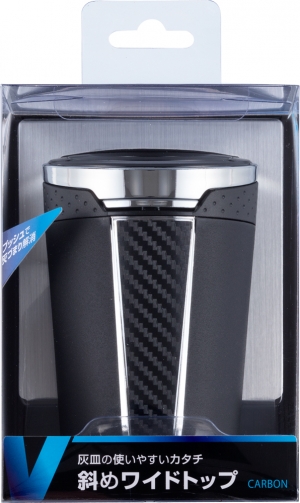 | This ashtray features a solar-powered LED for nighttime use and a sleek, carbon-fiber-patterned design, with a wide, angled mouth for ease of use. The lid swings open at the press of a button. The same button eliminates ash buildup in the extinguisher slots. |