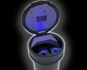 | This ashtray features a solar-powered LED for nighttime use. Its high-volume design allows for extended use between cleanings. The wide mouth makes for easy ashing and disposal of butts. Includes two extinguisher slots and stands for lit cigarettes, able to accommodate diameters all the way down to super slim (5–8 mm, 0.2–0.3 in). |