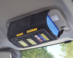 *A tissue case with convenient accessory storage that can be attached to a sun visor.