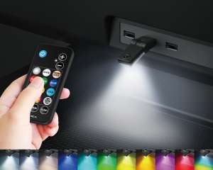 | ● Remote‑controlled LED light for USB‑A ports; choose from 8 solid colors and multiple flash patterns. ● Ideal for illuminating dark areas such as console boxes and center consoles. ● Light head with 3 LEDs and a 180° swivel to aim the beam in various directions. ● Eliminates fiddly micro‑button operation found on earlier products. ● Equipped with two white LEDs for a clear, natural white output. ● Supports brightness adjustment and a slow‑flash (“firefly”) mode. ● Memory function retains the previous setting after power‑off/restart (e.g., engine restart). ● Even with multiple add‑on USB lights (sold separately) installed, color changes are easy via the remote. |