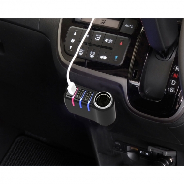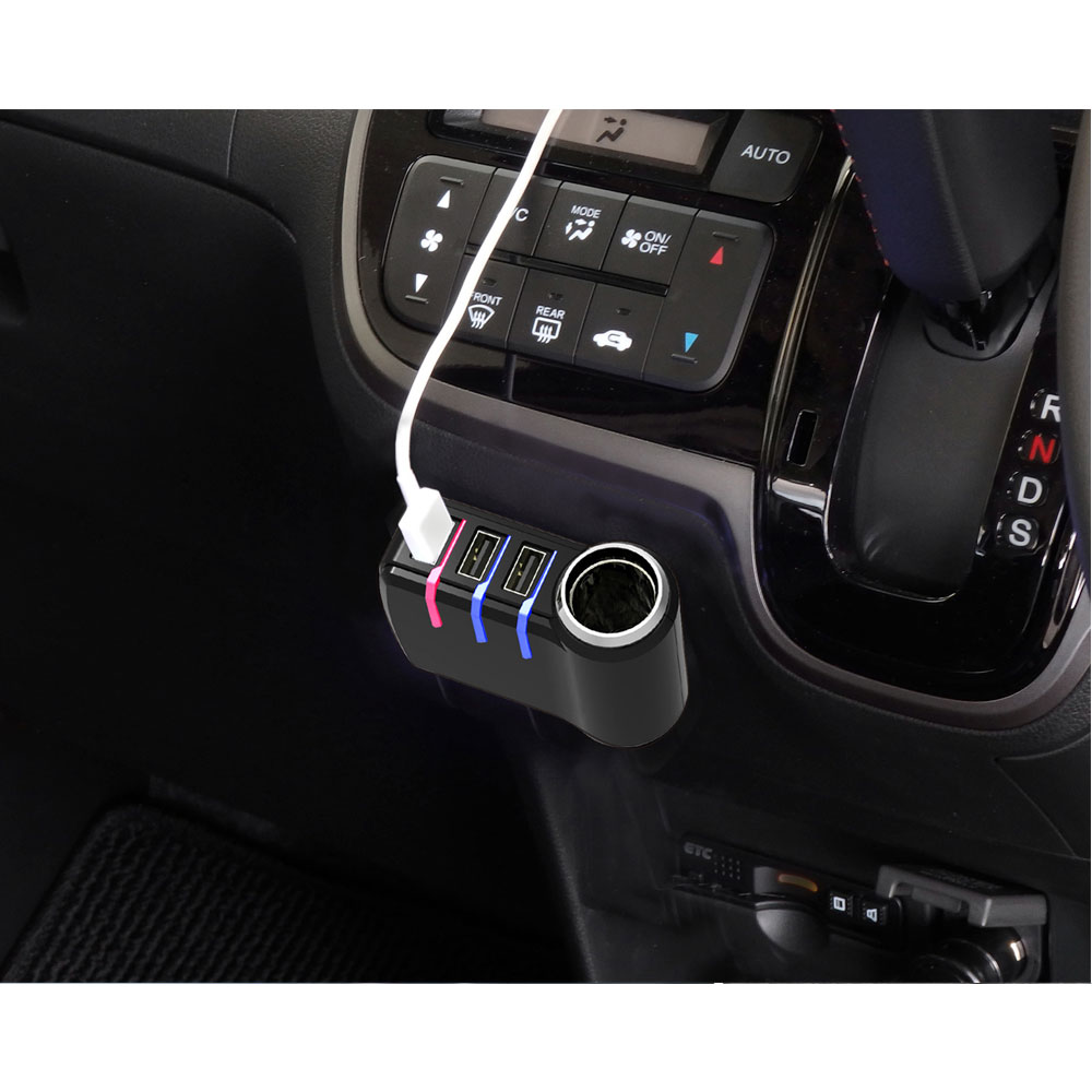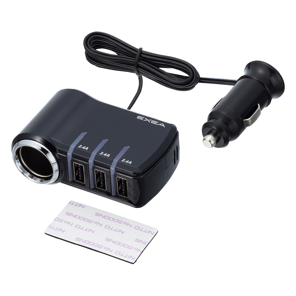 | *This vehicle charging adapter includes an indicator light to show each USB device’s charging state. Indicator lights turn red during charging and blue when charging is complete. *Automatic self-discriminating enables this product to detect the connected device type and charge using a suitable charging current. Independent control for each port enables simultaneous charging of different device types with optimal charging conditions for each. *Uses reversible USB ports so cables can be inserted without the hassle of checking the plug’s orientation. This vehicle charging adapter provides one 12V power socket and three 5V / 2.4A USB ports.(*maximum cumulative output over USB: 7.2A) *Conveniently mounts to a preferred location via two-sided adhesive tape. Compatible with vehicles equipped with a 12V power socket with an internal diameter from 21 to 22.5 mm. |