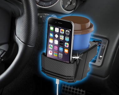 | This cup holder conveniently mounts to your vehicle’s A/C vents and is designed to hold disposable coffee cups, canned beverages, and 500ml (16.91 fl oz) bottled drinks. The cup holder incorporates a four-point silicone rubber support system to heighten stability and reduce vibration. Incorporates a smart pocket able to house smartphones with a maximum thickness of 0.51 in and maximum width of 3.15 in. |