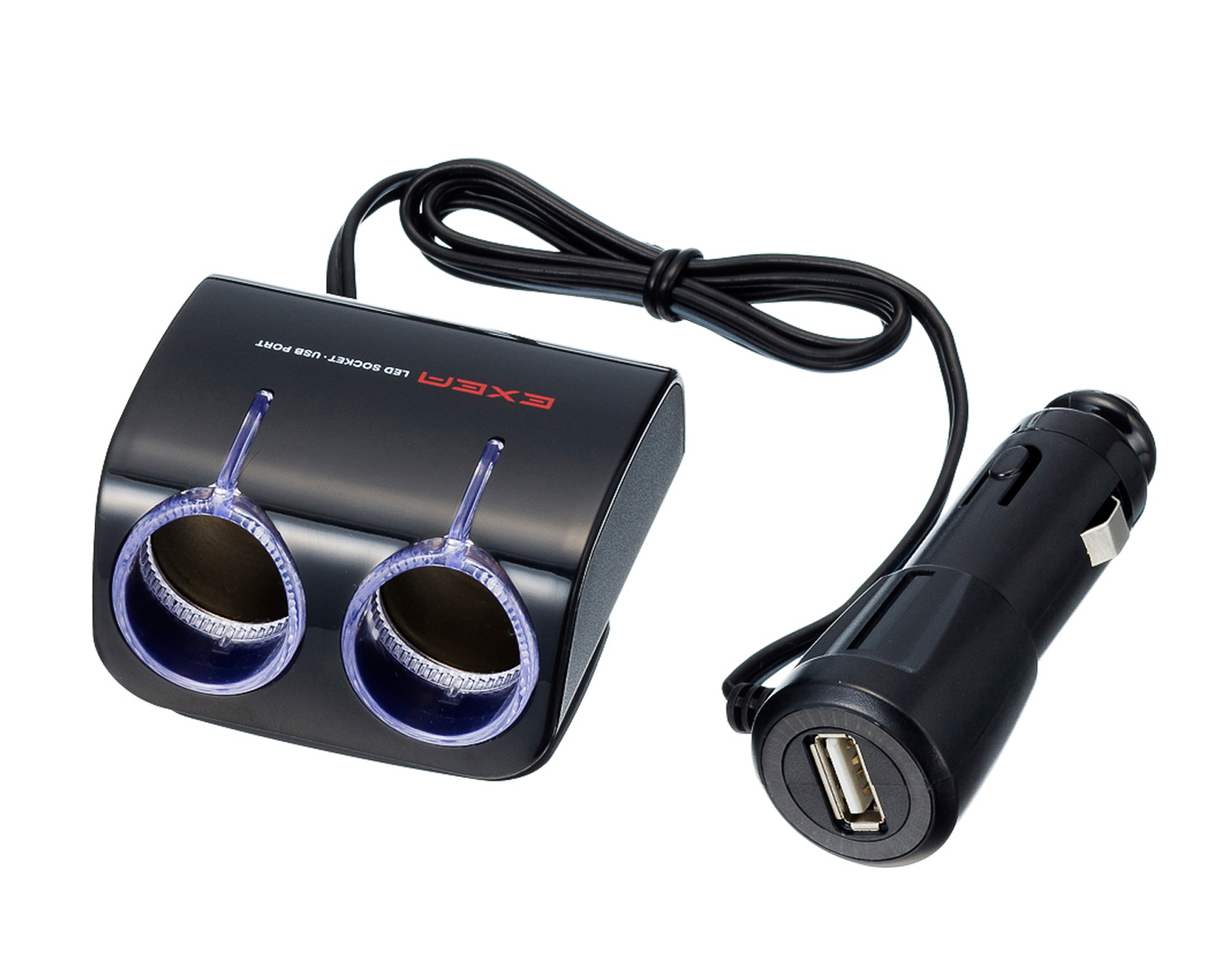 | This vehicle charging adapter provides one 5V / 1.2A USB port as well as an independently housed set of two 12V power sockets. Supplies power and charging over USB for iPods, smartphones, etc. The separate housing includes a stand, allowing for free 360-degree rotation after mounting. |