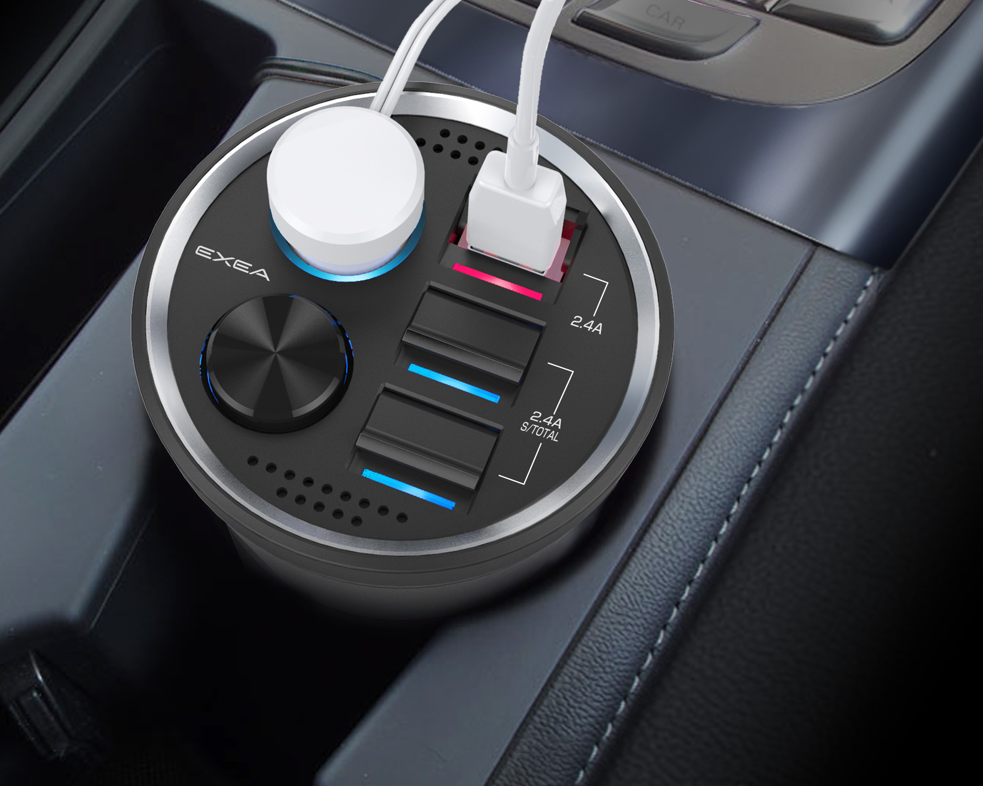 | ●A cup-type socket which can be installed in a drink holder to supply power (code length: 1.2 m). ●It is equipped with a 12V hole (accessory socket) cap to protect terminals from dust, etc., and a rotary USB cover. ●This product plugs directly into the power socket and features indicator lights that show the charging state of connected USB devices. Indicator lights turn red during charging and blue when charging is complete. USB three ports ●Automatic self-discriminating enables this product to detect the connected device type and charge using a suitable charging current. Independent control for each port enables simultaneous charging of different device types with optimal charging conditions for each. ●Uses reversible USB ports so cables can be inserted without the hassle of checking the plug’s orientation. ●A 12V hole and three 5V USB ports (total 4.8A. 2.4A (independent) + 2.4A (distributed to two ports)) are equipped. |