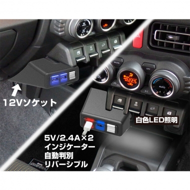 | *A socket that comes with a white LED, a 12V socket and two 5V/2.4A USB ports for Jimny and Jimny SIERRA vehicles. *Features a compact design that is positioned so as not to get in the way when using a tray. *Includes an indicator showing the USB charging status, and an automatic discriminating function that automatically determines the device connected and optimizes charging to the device. *Uses reversible USB ports so cables can be inserted without the hassle of checking the plug’s orientation. *The 12V socket is located at the back of the device, making it possible to cover up connecting plugs used. *Installed by simply inserting the accessory into a genuine socket (attached with tape on both sides). |