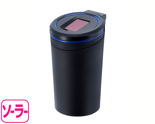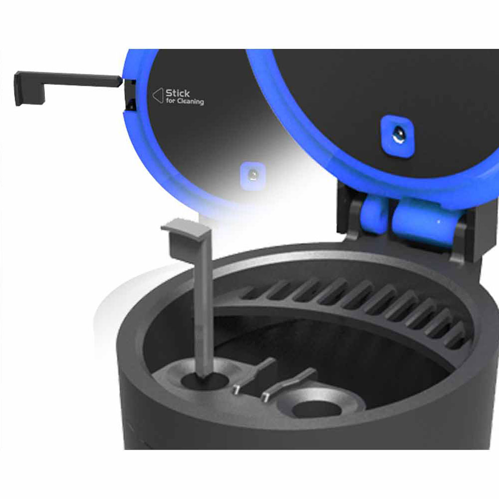 | This ashtray features an angled mouth for easy access. Includes the built-in extinguisher slots which accommodate super-slim through regular diameters and also includes stands for lit cigarettes. Includes a handy cleaning tool for simple, on-the-go removal of ash buildup in the extinguisher slots. A solar panel located on the top of the unit provides power for an internal white LED and detects ambient lighting conditions. When the vehicle interior is dark, the LED automatically turns on while the lid is open. |