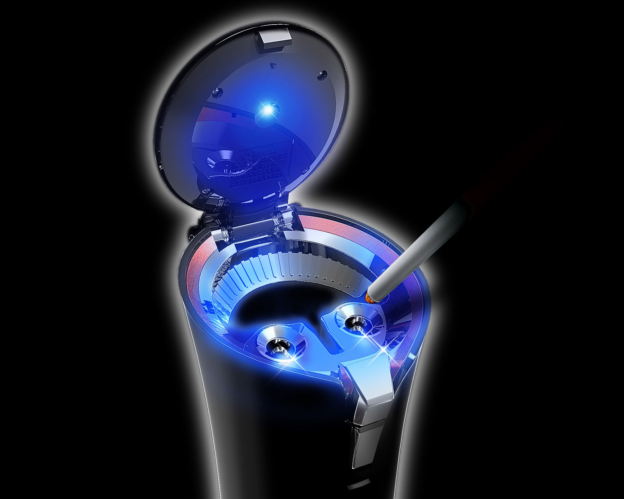 | This ashtray features a solar-powered LED for nighttime use. The lid opens at a 90-degree angle for normal use, and the lid and extinguisher portions can be opened together to a full 180 degrees. The 180-degree, fully-open position allows for ash and butts to be disposed of easily, cleanly and completely. Includes two extinguisher slots and stands for lit cigarettes, able to accommodate diameters all the way down to super slim (5–8 mm, 0.2–0.3 in). |