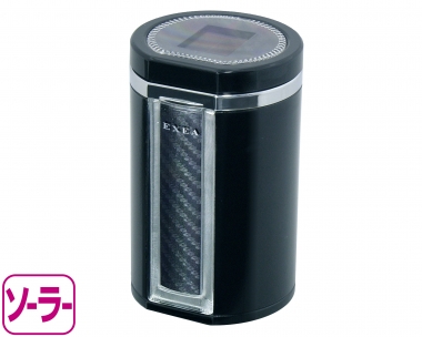 | This ashtray includes two extinguisher slots; the perimeters of the slots illuminate during nighttime use. Features a glossy black body and a carbon-fiber-patterned front panel which also lights up. Requires no disposable batteries, relying on a built-in solar panel instead. The LED in this version is blue. |