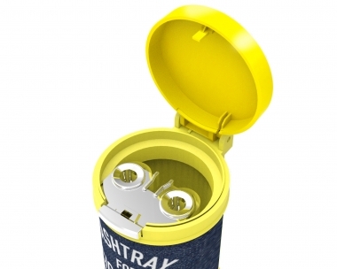 | This stylish ashtray is built for convenient, hassle-free smoking while driving. It helps trap ash and fumes inside, and its lid swings open at the press of a button. Includes a one-touch cleaning button to eliminate ash buildup in the extinguisher slots. |
