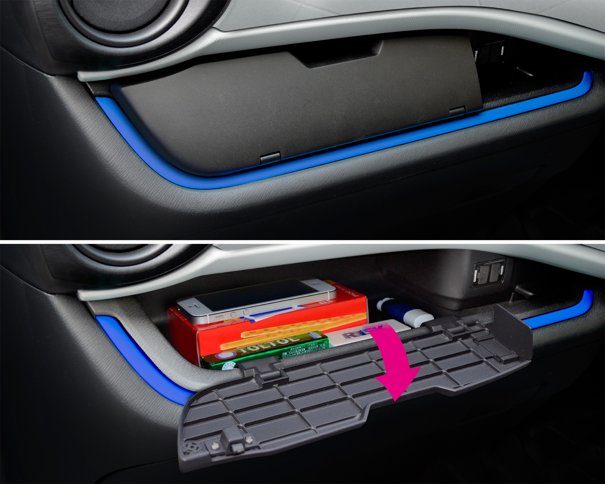| This flip-open front-passenger-side tray cover is designed specifically for use in the DAA-NHP10-series Aqua, Toyota. It helps keep the car interior looking neat. Includes a gap at the top that can be used for dispensing tissues. It attaches simply with the use of two-sided adhesive tape. |