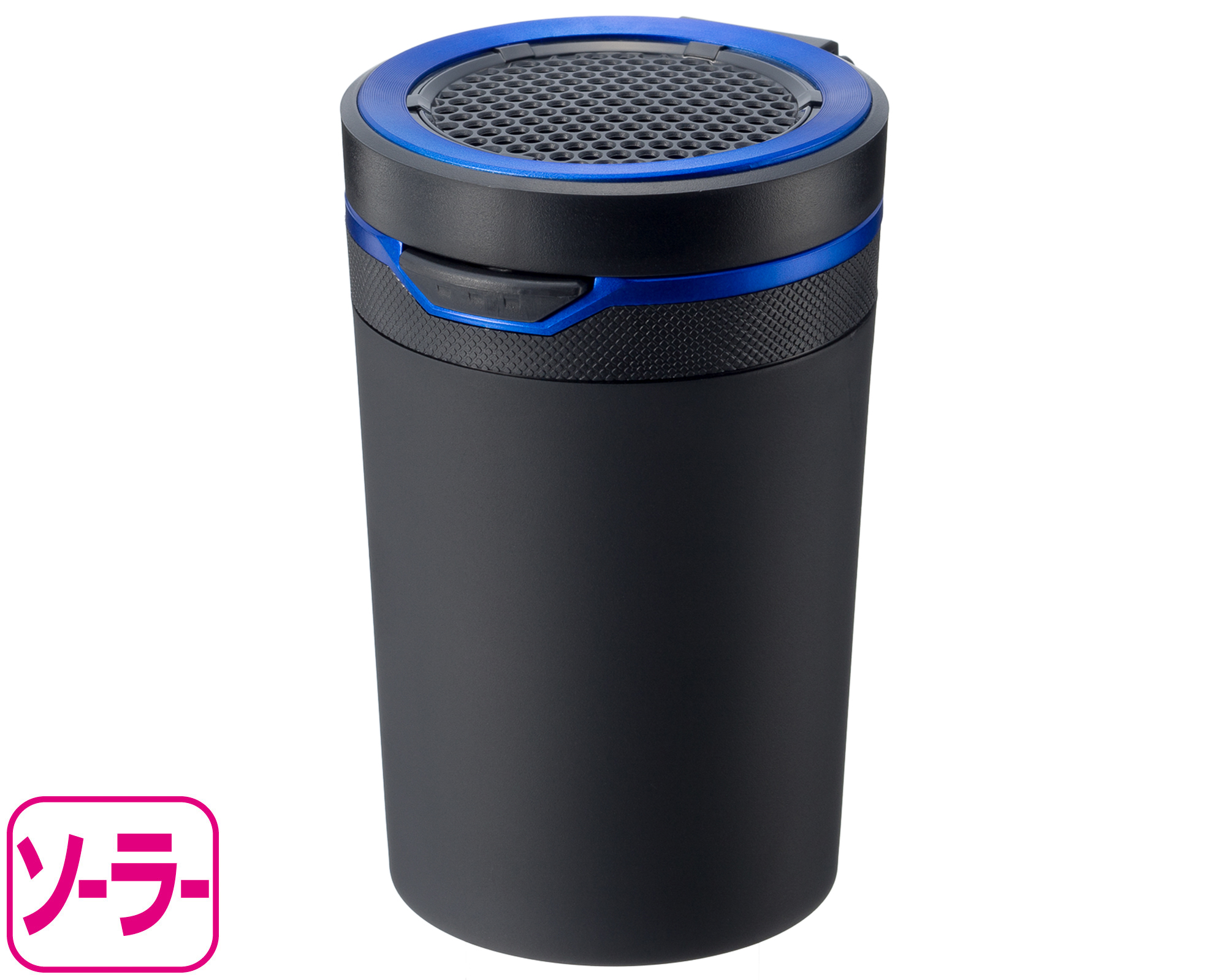 | This sporty ashtray features stylish blue accents and a solar-powered blue LED for nighttime use. The lid swings open at the press of a button. The same button eliminates ash buildup in the extinguisher slots. Includes two extinguisher slots and stands for lit cigarettes, able to accommodate diameters all the way down to super slim (5–8 mm, 0.2–0.3 in). |