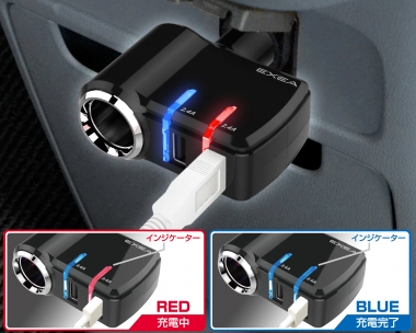 | * This product plugs directly into the power socket and features indicator lights that show the charging state of connected USB devices. (Indicator lights turn red during charging and blue when charging is complete.) * Automatic self-discriminating enables this product to detect the connected device type and charge using a suitable charging current. Independent control for each port enables simultaneous charging of different device types with optimal charging conditions for each * Uses reversible USB ports so cables can be inserted without the hassle of checking the plug’s orientation. * This device powers two 12 V sockets and USB 2.0 ports (combined total of 5 V / 2.4 A). * The plug's 90-degree swinging design enables adjustment of plug angle. * Compatible with vehicles equipped with a power socket of an internal diameter from 21.0 mm to 22.5 mm (0.83 in. to 0.89 in.). |