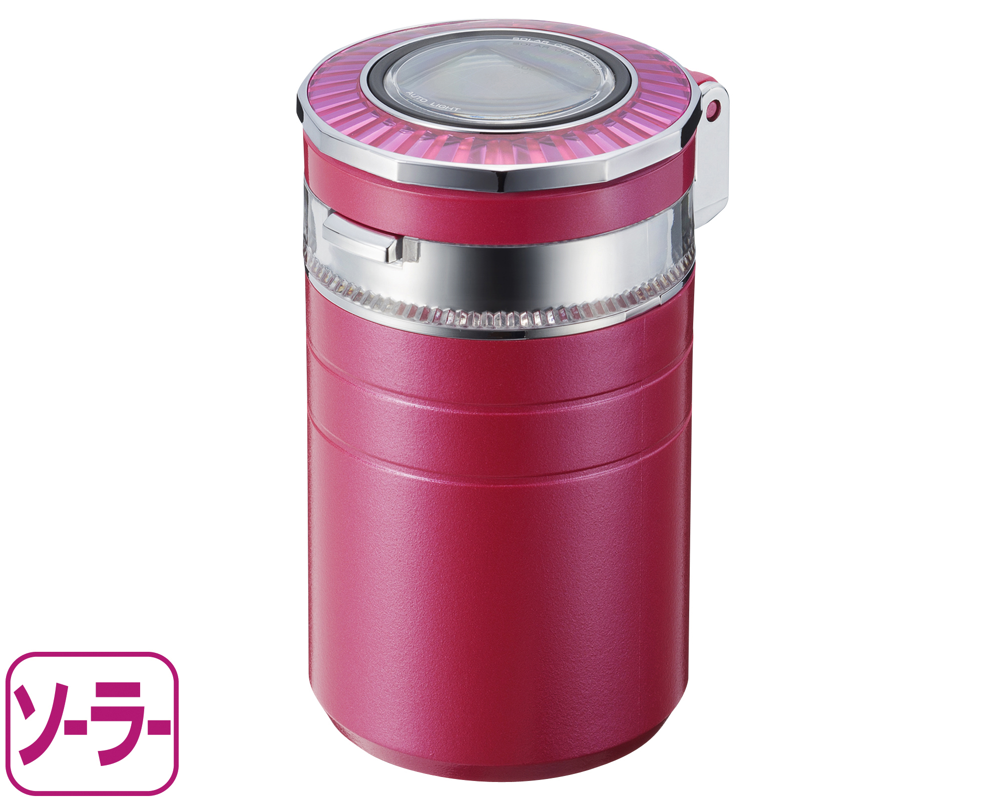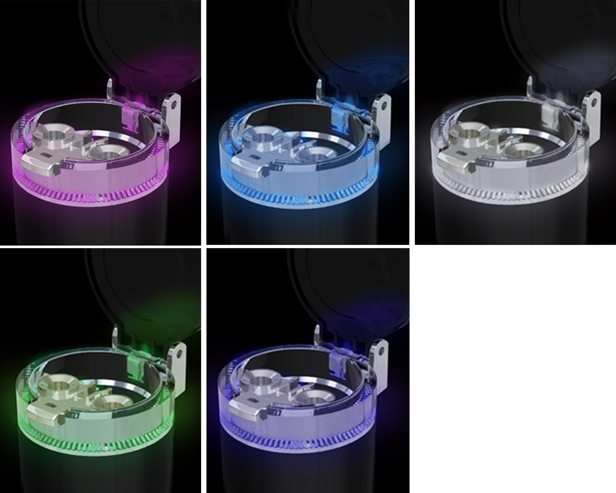 | Features a light-up bezel which changes color when rotated. Five different color settings are available. The lid swings open at the press of a button. The same button eliminates ash buildup in the extinguisher slots. Includes two extinguisher slots and stands for lit cigarettes, able to accommodate diameters all the way down to super slim (5–8 mm, 0.2–0.3 in). |