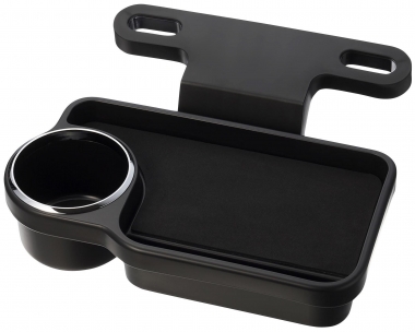 | This rear seat tray and drink holder attaches easily to a headrest and features a conveniently adjustable design. Slides in left or right, and folds down when not in use. Installs easily by passing the headrest rods through the tray mount. The drink holder is lined with a stylish, chrome ring. |