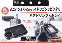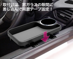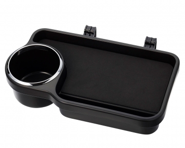 | This tray and drink holder mounts conveniently to the inside of your vehicle’s door. Installs easily via two-sided adhesive tape along with hooks inserted into the door’s window sill. The drink holder is lined with a stylish, chrome ring. |