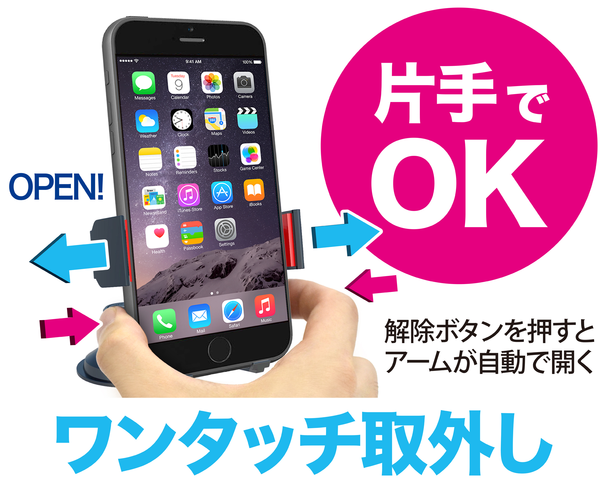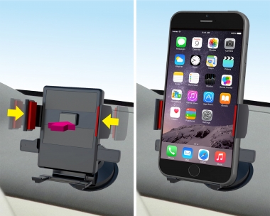| This vehicle smartphone mount features a simple, automatic mounting solution for your phone. With one easy motion, the grips snap securely onto devices measuring 65 - 82mm ( 2.56 to 3.23 in ) wide. Freely attaches to a desired location on the dash via suction cup. (Includes gel and sticker disc for use on uneven surfaces.) |