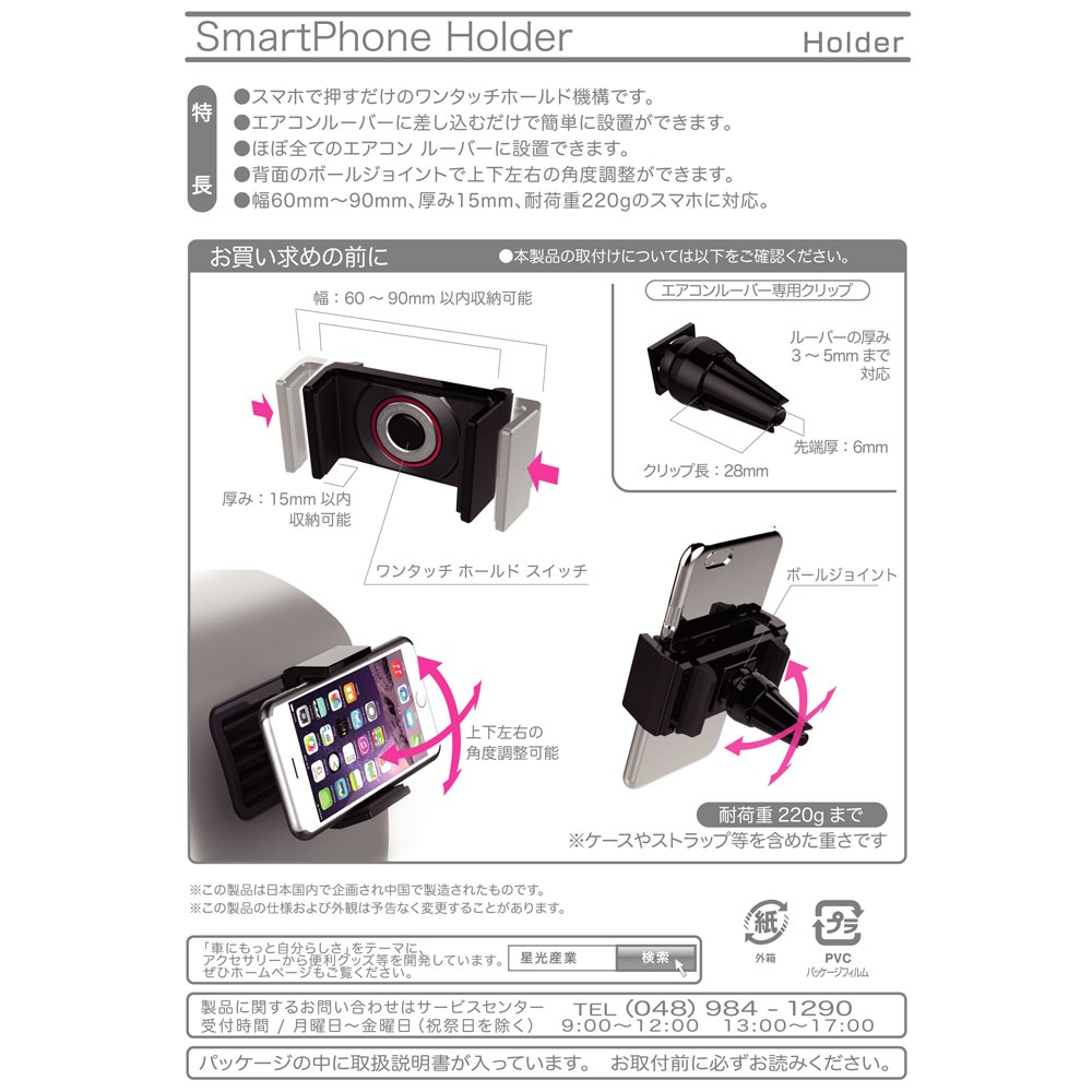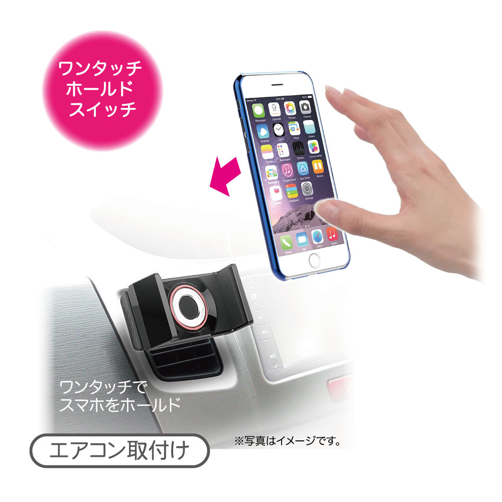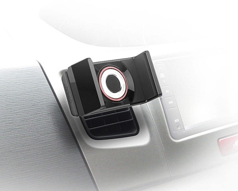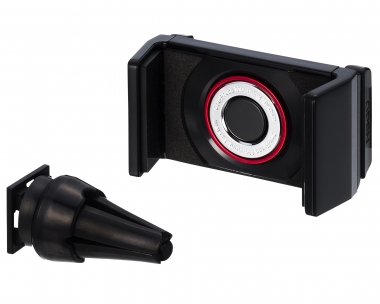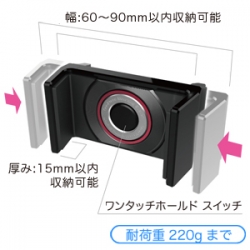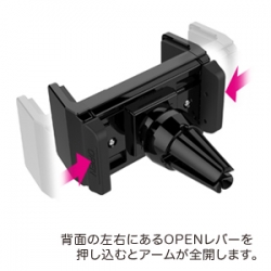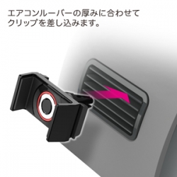 | This vehicle smartphone mount uses a specialized clip to attach to A/C vent louvers. Simply press your phone into the mount, and the mount’s grips latch on to the device. Accommodates devices measuring 60mm to 90mm( 2.36 to 3.54 in ) wide and up to 15mm ( 0.59 in ) thick, and weighing no more than 220g( 7.76 oz ). |