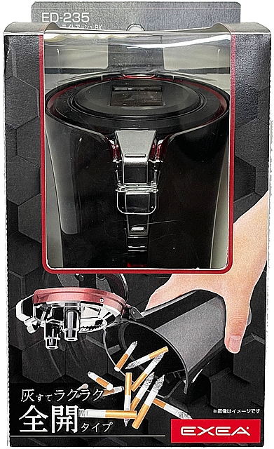 | This ashtray features a solar-powered LED for nighttime use. The lid opens at a 90-degree angle for normal use, and the lid and extinguisher portions can be opened together to a full 180 degrees. The 180-degree, fully-open position allows for ash and butts to be disposed of easily, cleanly and completely. Includes two extinguisher slots and stands for lit cigarettes, able to accommodate diameters all the way down to super slim (5–8 mm, 0.2–0.3 in). |