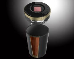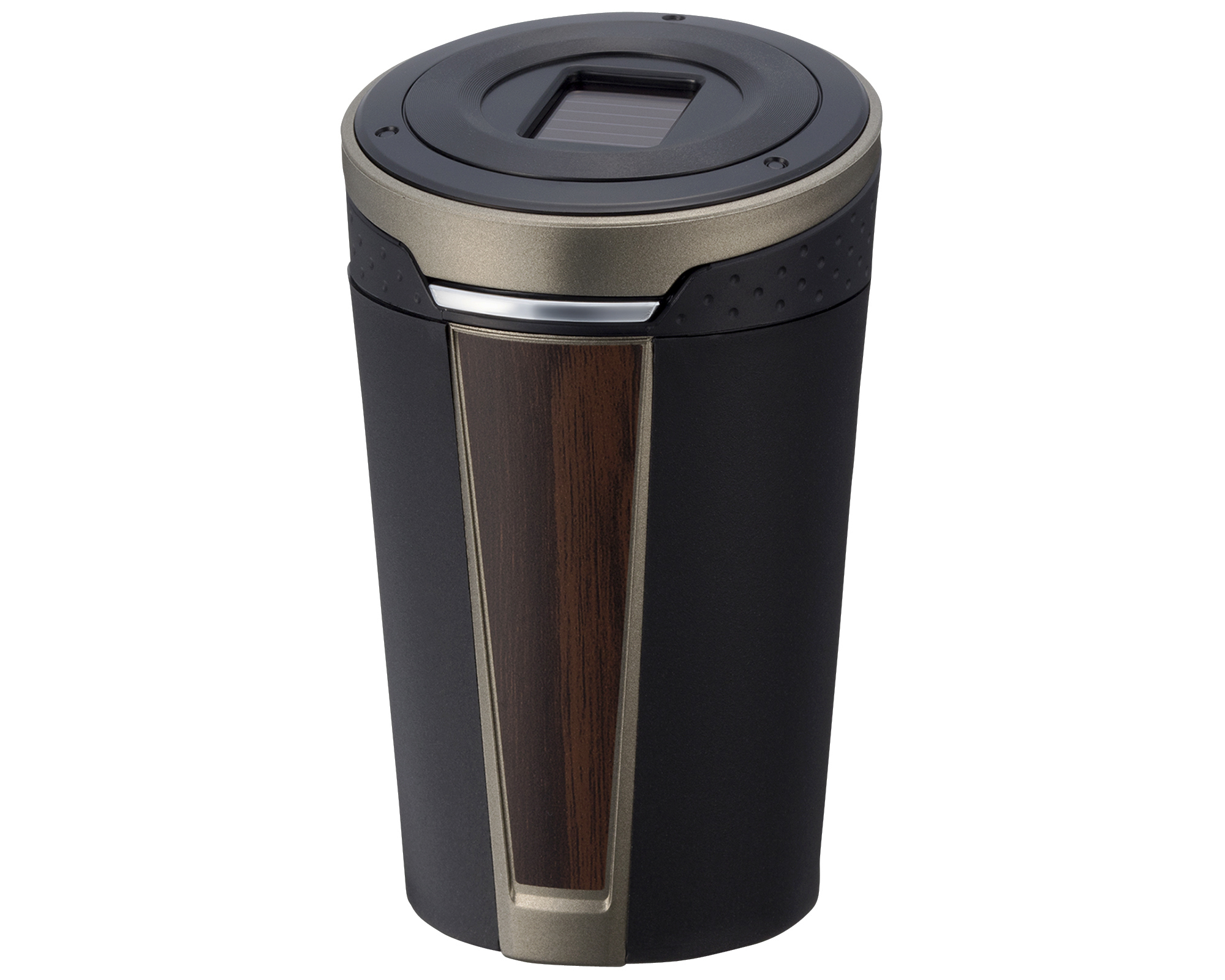 | This ashtray features a solar-powered LED for nighttime use and an elegant wood-style design, with a wide, angled mouth for ease of use. The lid swings open at the press of a button. The same button eliminates ash buildup in the extinguisher slots. |
