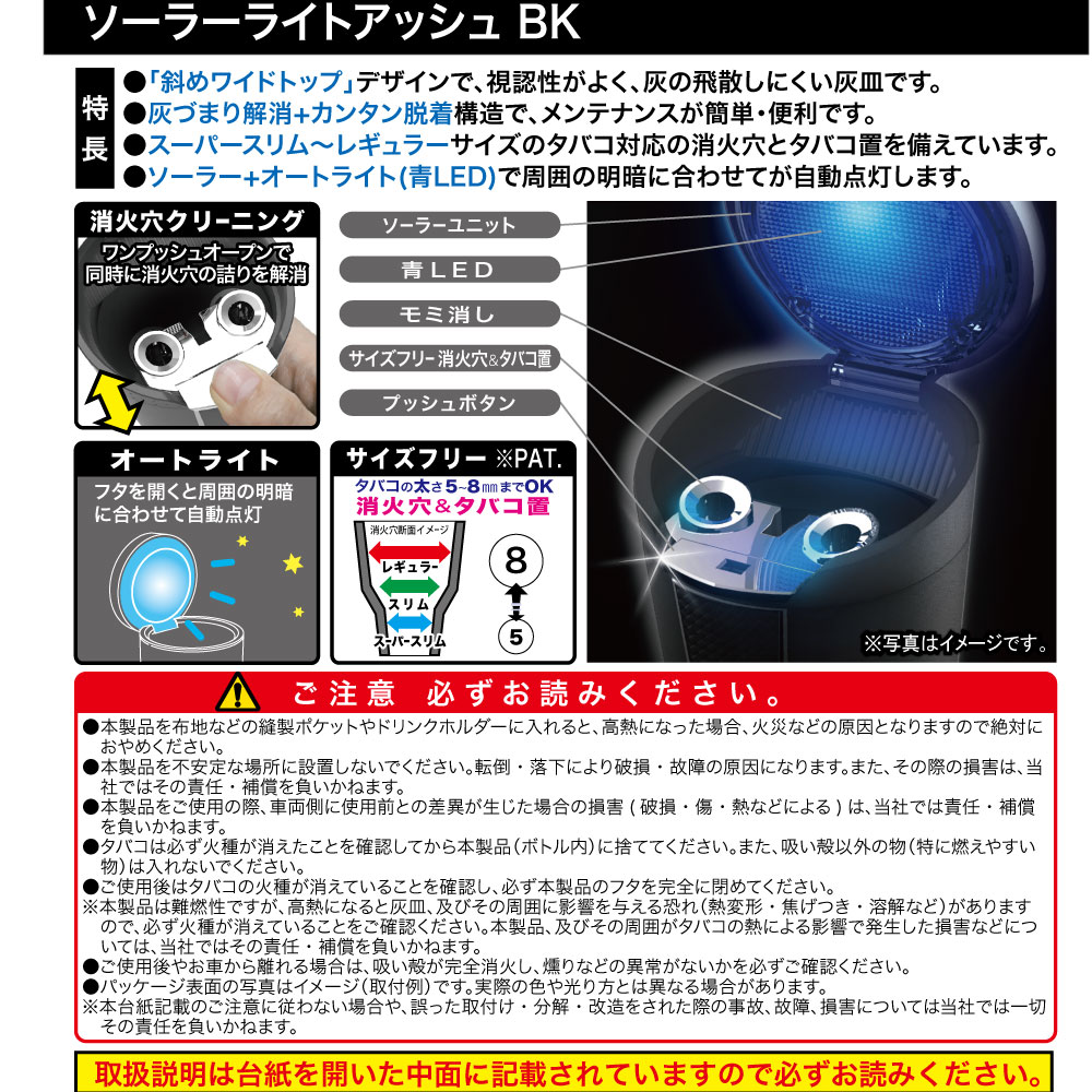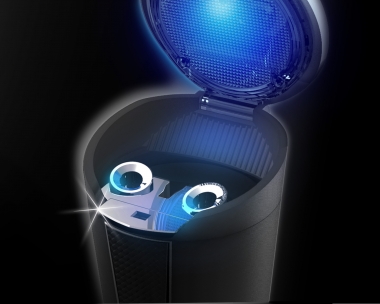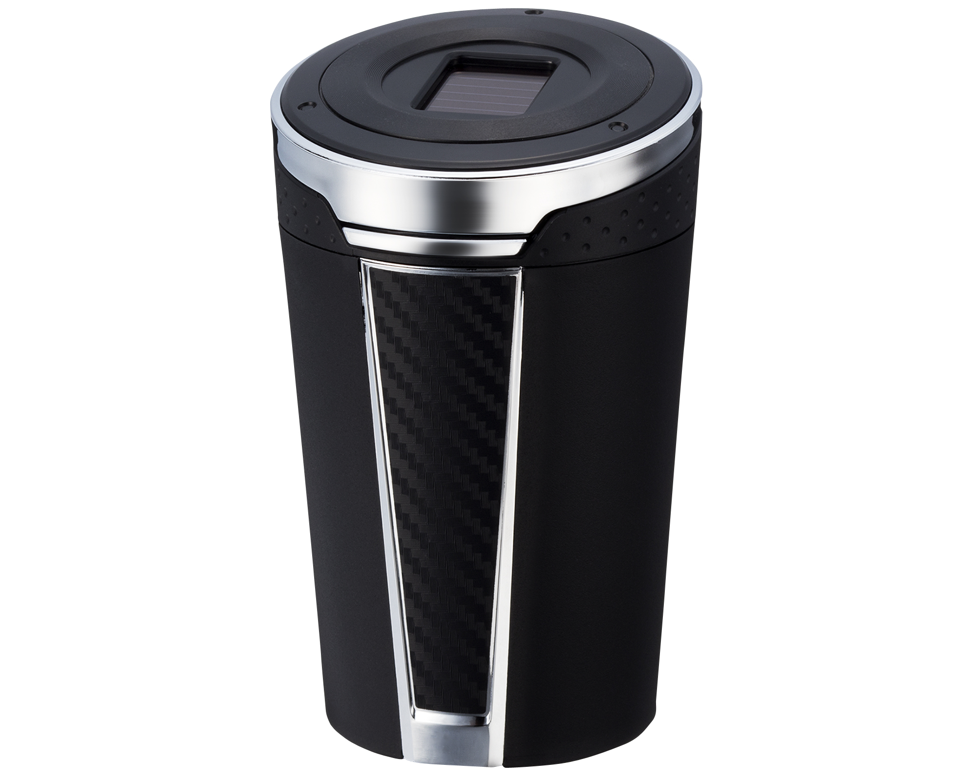 | This ashtray features a solar-powered LED for nighttime use and a sleek, carbon-fiber-patterned design, with a wide, angled mouth for ease of use. The lid swings open at the press of a button. The same button eliminates ash buildup in the extinguisher slots. |