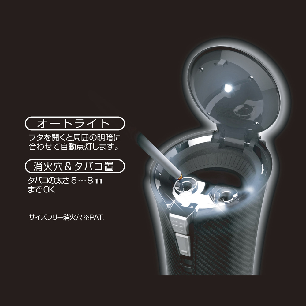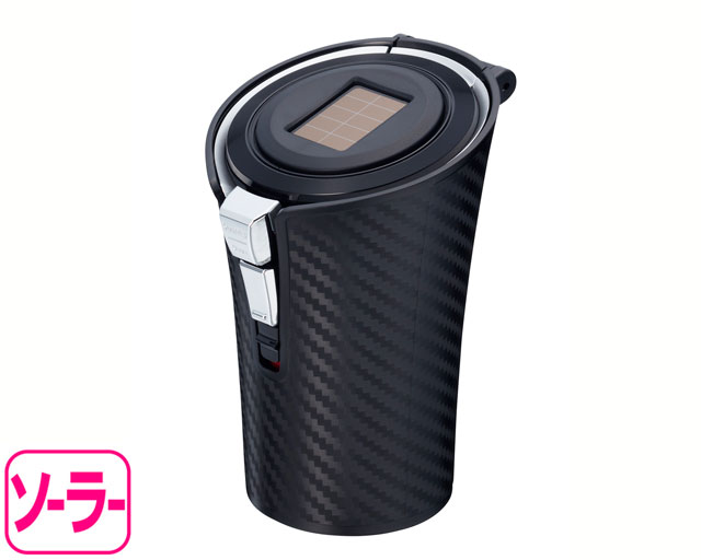 | This ashtray features a sleek carbon-fiber-patterned design and a solar-powered LED for nighttime use. The lid opens at a 90-degree angle for normal use, and the lid and extinguisher portions can be opened together to a full 180 degrees. (* A locking mechanism prevents accidental opening of the extinguisher portion during normal use.) The 180-degree, fully-open position allows for ash and butts to be disposed of easily, cleanly and completely. Includes the built-in extinguisher slots which accommodate super-slim through regular diameters and also includes stands for lit cigarettes. Includes a one-touch cleaning button to eliminate ash buildup in the extinguisher slots. A solar panel located on the top of the unit provides power for an internal white LED and detects ambient lighting conditions. When the vehicle interior is dark, the LED automatically turns on while the lid is open. |