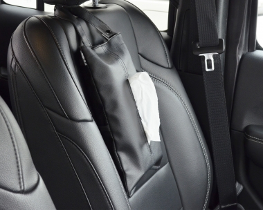 | A vertical-facing tissue case that can be attached to a head rest. Includes two mesh pockets at the back for added convenience when storing small items. Uses velcro tape for the opening, allowing it to blend in with the car interior without revealing the tissue box inside the case. Compatible with a wide range of tissue options, from soft packed tissues, to box tissues up to 2.55 inches (65 mm)thick. Uses high-grade materials that resemble genuine leather. The extended belt can be used to rotate the tissue case while suspended, making it possible to seamlessly switch between taking tissues and using the pockets. |