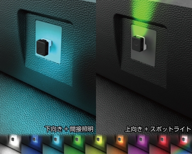 | *USB port with light function that lets you choose from eight different single-color lights, or a gradation light setting. *Ideal for lighting up dark areas of the car, such as the console box or center console *Features an easy to use touch sensor for adjusting the color and brightness settings. *The LED lights up the area around the plug-in port to provide indirect lighting. * Can be turned OFF *You can adjust the brightness and switch to Firefly Mode. *Includes a memory function that retains lighting settings when restarting the engine after being switched off. A reversible USB can be inserted regardless of orientation to light up any direction. *The direction of lighting can be changed by switching the lit LED, providing support for different USB port orientations (horizontal or vertical) depending on the car model or device |