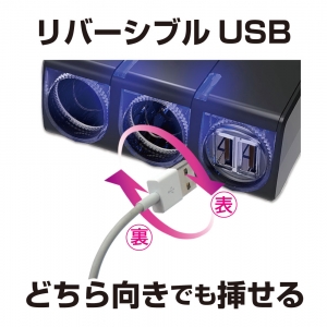 | ●12V/24V車対応の2連ソケットと5V/2.4A(合計最大)をUSB2ポートに分配したソケットです。 ●USBポートは接続した機種を自動で判別し、機種に合った電流で最適な充電を行う自動判別機能を採用しています。 各ポートで独立した制御を行いますので、異なる機種を同時に挿してもそれぞれ最適な充電を行えます。 ●USBの表裏を気にせず挿せるリバーシブルUSBポート採用。 ●通電モニターはブルーLEDを2個使用し、夜間の車内を美しく演出します。 ●お車のソケットに差し込むだけで使える簡単取付けのダイレクトタイプです。90°首振りプラグで角度の調整ができます。 ●お車のソケットの内径がφ21mm~φ22.5mmまでの車種に使用可能です。 リバーシブルタイプのUSB ポートの注意点はコチラ |