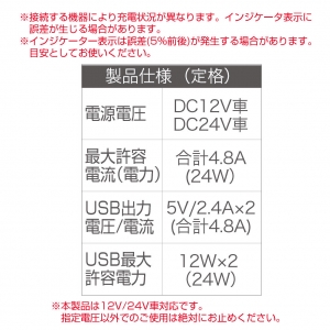 | オープンプライス ■製品サイズ:H32×W32×D71 ■パッケージ:H180×W85×D70 57g ■⼩箱サイズ:H200×W310×D240 20個⼊ ■外箱サイズ:H425×W490×D325 80個⼊ ■定格:電源電圧/DC12,24V 電流/4.8A以下 USB出⼒/DC5V 2.4A(2ポート合計4.8A) ■JAN:4974267051579 |