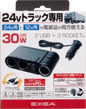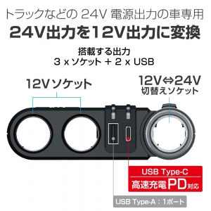 | ●トラックなどの24V電源出力の車専用 ●24V出力を12V出力へと変換するDC/DCコンバーター ●12Vを出力するソケットは3口あります ・そのうち1口は12Vと24Vに出力電圧を切り替えることができるので24V電源の機器も併せて使用できます ・24V出力時は、誤って12V用品を使用しないようにアンバー色のLEDが点灯します ●USBの出力は2ポートあります ・そのうち1口はUSB Type-Cポートです ・USB PDに対応しているので、対応のスマホ※を最大出力18Wで高速に充電することができます ・残り1口はUSB Type-Aポートです ・最大出力5V/2.4Aで表裏を気にしないで挿せるリバーシブルタイプです ・接続機器を自動で判別して最適充電を行う機能を搭載しています ・2ポートとも、一目で充電状態が分かるインジケーターを搭載しています ●お好きな場所に両面テープで貼り付けられる約1mのコード付きです ※お手持ちの機器のUSB PD対応に関してはキャリア・メーカー・説明書でご確認ください |