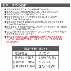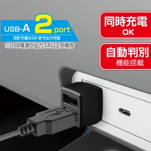 | ●USB-C電源をUSB-Aに変換し、2つに分配する同時充電対応のUSBアダプターです。 ●コンパクトサイズで取付け後も目立ちません。 ●2ポート合計最大3A、15Wまで対応。(※ご使用のUSB電源が出力3A以上の場合) ●自動判別ICを搭載、接続機器に3A以下の最適な電力を供給できます。 |